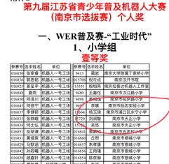 - 我校四年级薛广瑞、陈泽韬两位小朋友摘得了本次比赛WER项目的冠军,曹雨凡和陈鼎轩位居一等奖第五名,杨俊寒和陈一卓位居一等奖的第七名。